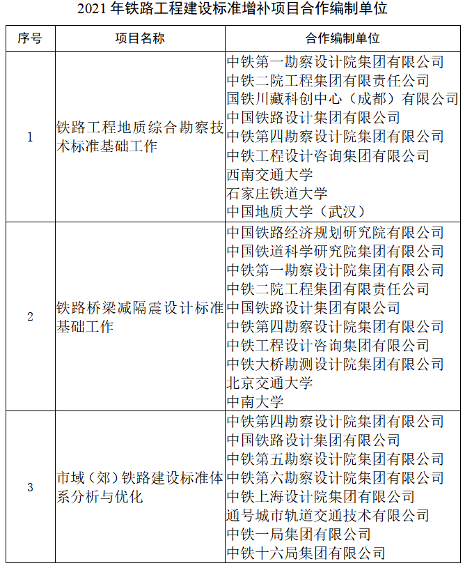 根據(jù)《鐵路工程建設(shè)標(biāo)準(zhǔn)管理辦法》(國(guó)鐵科法〔2014〕24號(hào))規(guī)定,國(guó)家鐵路局規(guī)劃與標(biāo)準(zhǔn)研究院在公開(kāi)征集、專(zhuān)家論證的基礎(chǔ)上,確定了2021年鐵路工程建設(shè)標(biāo)準(zhǔn)增補(bǔ)項(xiàng)目合作編制單位選擇方案,現(xiàn)予公示:
