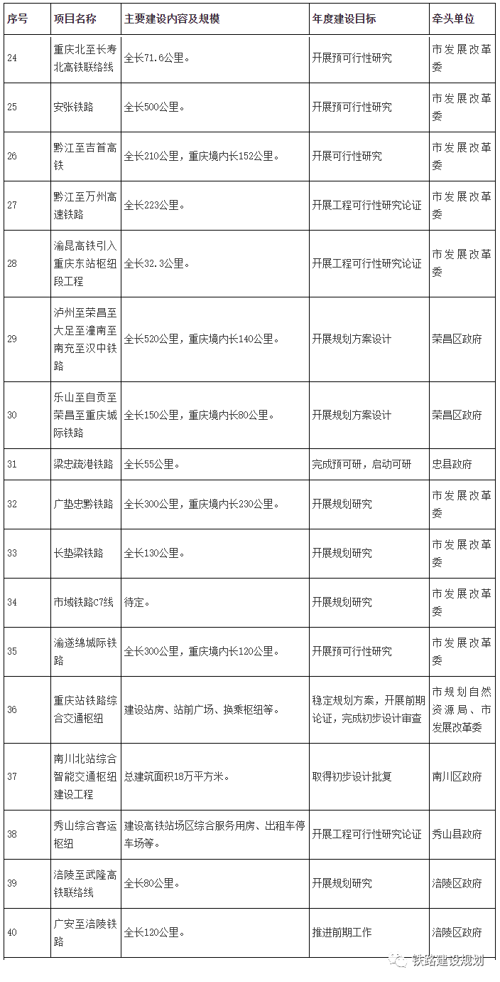 重慶北至長(zhǎng)壽北高鐵聯(lián)絡(luò)線、安張鐵路、渝遂綿城際鐵路將開(kāi)展預(yù)可行性研究;黔江至吉首高鐵將開(kāi)展可行性研究;黔江至萬(wàn)州高速鐵路、渝昆高鐵引入重慶東站樞紐段工程將開(kāi)展工程可行性研究論證。