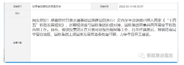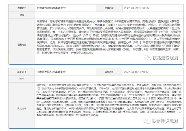 近日,甘肅省發(fā)改委在官網(wǎng)主任信箱答復(fù)了網(wǎng)友關(guān)于平慶鐵路建設(shè)標(biāo)準(zhǔn)問題的信件,詳情如下:
