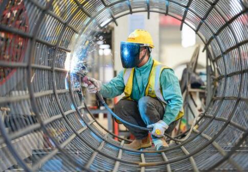 5月17日,建設(shè)者在包銀高鐵跨海勒太斯溝特大橋首根樁基施工現(xiàn)場進行焊接作業(yè)。