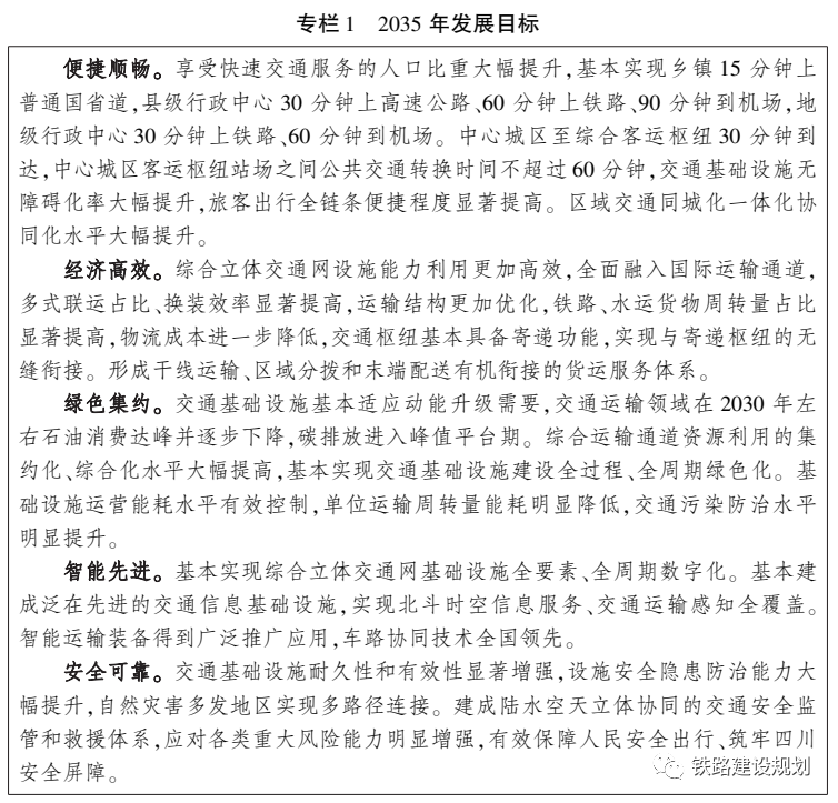 到2035年,基本建成便捷順暢、經(jīng)濟(jì)高效、綠色集約、智能先進(jìn)、安全可靠的現(xiàn)代化高質(zhì)量四川省綜合立體交通網(wǎng);基本建成全國(guó)交通“第四極” ,“四向八廊” 戰(zhàn)略性綜合交通走廊通歐達(dá)海,國(guó)際性綜合交通樞紐集群聯(lián)通全球。