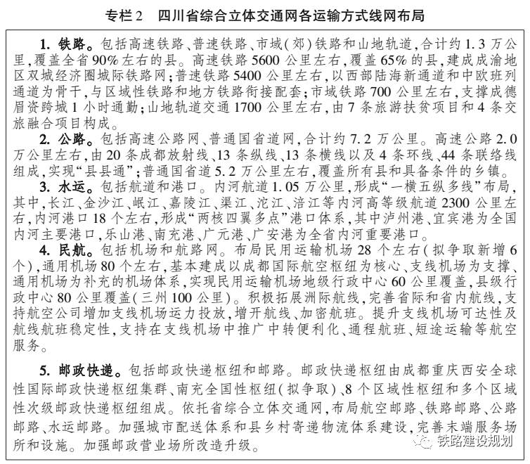在構(gòu)建完善的綜合立體交通網(wǎng)方面,根據(jù)《綱要》,到 2035年,四川省綜合立體交通網(wǎng)實(shí)體線網(wǎng)總規(guī)模9.5萬(wàn)公里左右(不含航路、郵路、農(nóng)村公路里程) ,其中,鐵路1.3萬(wàn)公里左右,公路7.2萬(wàn)公里左右,航道1.05萬(wàn)公里左右;另規(guī)劃農(nóng)村公路41.5萬(wàn)公里左右,其中縣道6.6萬(wàn)公里,鄉(xiāng)道10.9萬(wàn)公里,村道24.0萬(wàn)公里。內(nèi)河港口18個(gè)左右,民用運(yùn)輸機(jī)場(chǎng)28個(gè)左右,通用機(jī)場(chǎng)80個(gè)左右,郵政快遞樞紐10個(gè)左右。