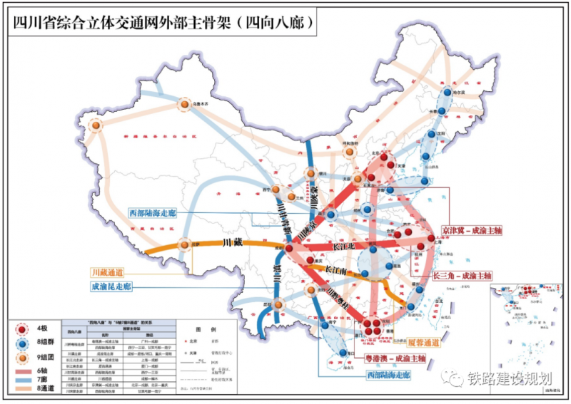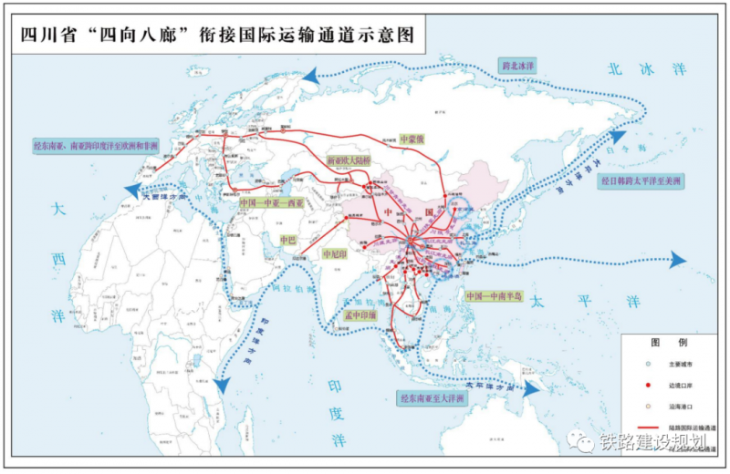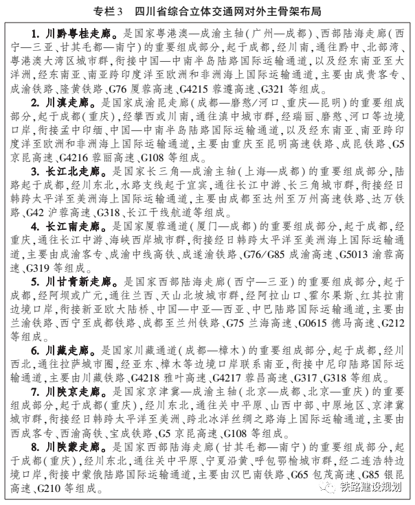 對(duì)外“四向八廊”,面向四方,構(gòu)建8條戰(zhàn)略性綜合交通走廊,打造四川“四向拓展、全域開(kāi)放” 開(kāi)放態(tài)勢(shì)的主骨架,承擔(dān)成渝地區(qū)雙城經(jīng)濟(jì)圈與全國(guó)主要城市群及地區(qū)的聯(lián)系功能,銜接7條陸路國(guó)際運(yùn)輸通道,以及4條海上國(guó)際運(yùn)輸通道。