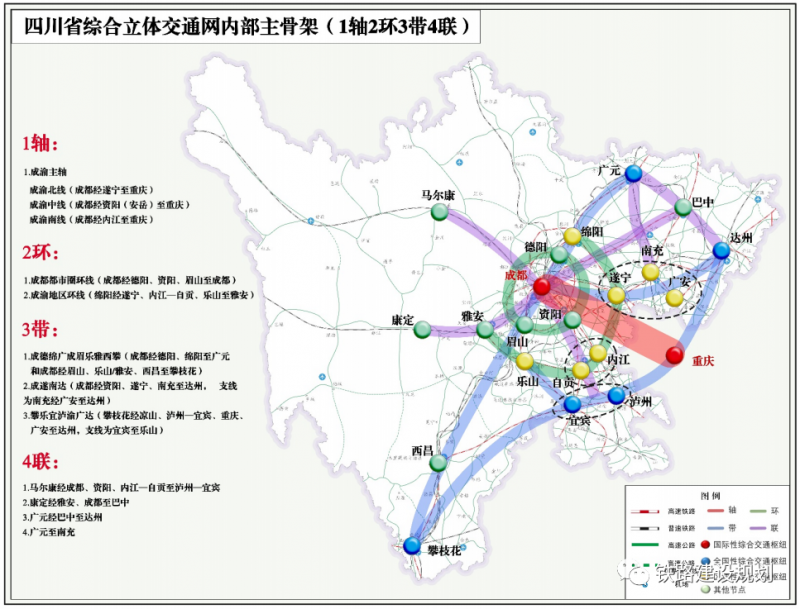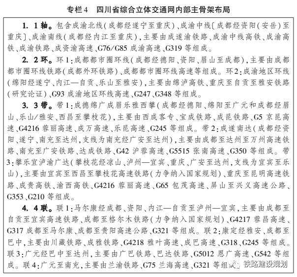 對(duì)于內(nèi)部“1軸2環(huán)3帶4聯(lián)”,《綱要》明確,“1軸”聯(lián)系成渝雙核,“2 環(huán)”串聯(lián)成都都市圈、成渝地區(qū)雙城經(jīng)濟(jì)圈主要城市,“3帶”強(qiáng)化對(duì)“三帶” 區(qū)域經(jīng)濟(jì)布局的交通支撐,包含成德綿廣成眉樂(lè)雅西攀,成遂南達(dá),攀樂(lè)宜瀘渝廣達(dá)?!?聯(lián)”補(bǔ)充連接其余地級(jí)行政中心,包含馬爾康經(jīng)成都、資陽(yáng)、內(nèi)江—自貢至瀘州—宜賓,康定經(jīng)雅安、成都至巴中,廣元經(jīng)巴中至達(dá)州,廣元至南充。