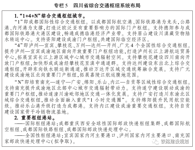 強(qiáng)化全國(guó)性樞紐銜接輻射帶動(dòng)作用,提升瀘州—宜賓、攀枝花、達(dá)州、廣元的重要門(mén)戶樞紐功能。