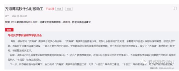6月9日,針對(duì)齊海滿高鐵規(guī)劃建設(shè)事宜,呼倫貝爾市發(fā)改委答復(fù):