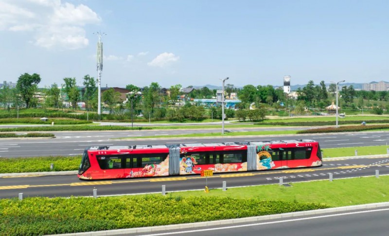 “天府號”主色調(diào)為生態(tài)綠,車身展示了綠色低碳元素,如生態(tài)城市建設、熊貓、竹文化等元素,與智軌低碳環(huán)保的特點相契合。