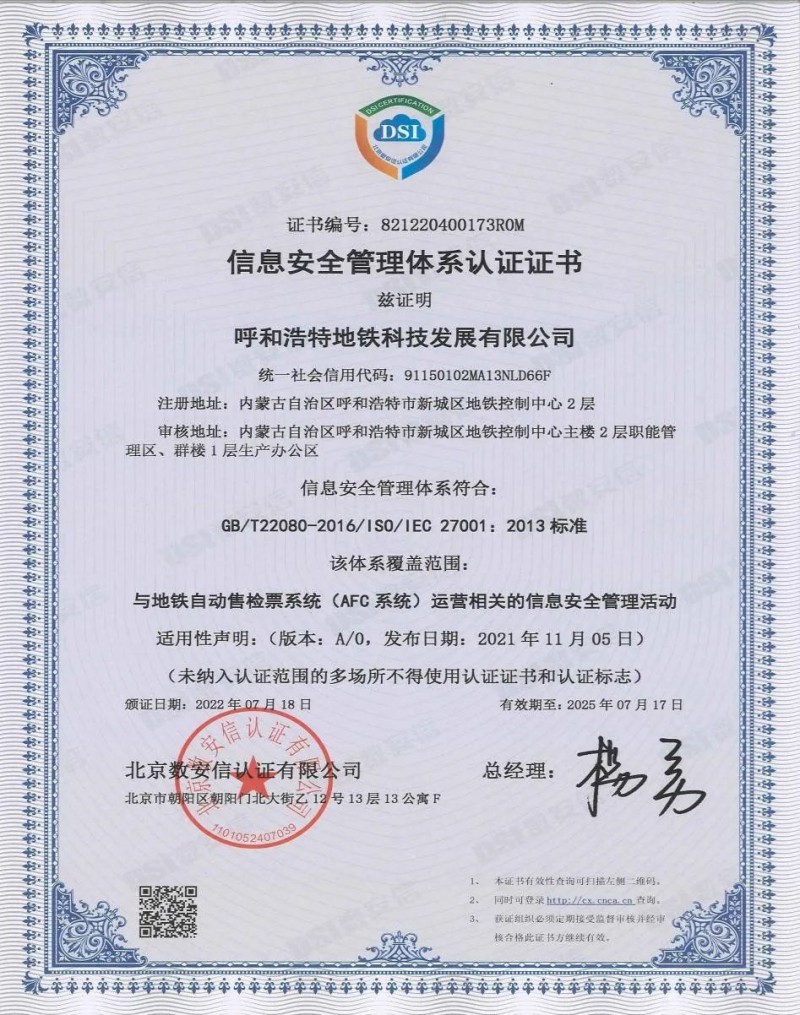 目前地鐵科技公司已具備ISO27001信息安全管理體系認(rèn)證、ISO9001質(zhì)量管理體系、ISO14001環(huán)境管理體系、ISO45001職業(yè)健康安全管理體系,共同構(gòu)建起公司“四維一體”的質(zhì)量管理機(jī)制,公司將繼續(xù)努力建設(shè)職責(zé)明確、程序規(guī)范、務(wù)實(shí)高效、運(yùn)轉(zhuǎn)協(xié)調(diào)的管理體系,全面規(guī)范各項(xiàng)管理行為,助力公司高質(zhì)量發(fā)展。