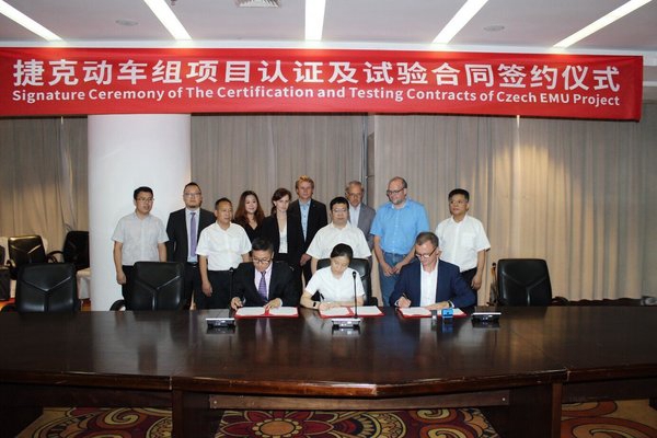 SGS鐵路機(jī)車車輛及鐵路工程經(jīng)理劉騰、中車集團(tuán)株機(jī)公司唐微部長、 VUZ捷克鐵路研究院執(zhí)行總裁 Frantisek Bures先生簽訂捷克動(dòng)車組項(xiàng)目認(rèn)證及試驗(yàn)合同