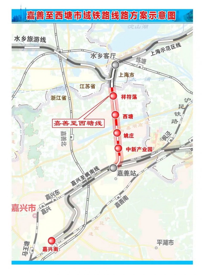 項目起自嘉興至楓南市域鐵路嘉善站(不含),途經(jīng)中新產(chǎn)業(yè)園、姚莊、西塘等,止于浙滬省界,全長20.4公里,均在嘉善境內(nèi),設中新產(chǎn)業(yè)園、姚莊、西塘、祥符蕩4座高架站。