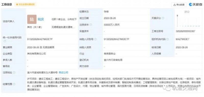 8月26號,無錫錫宜軌道交通有限公司注冊成立,注冊資本50000萬人民幣。該公司由無錫地鐵集團有限公司(占股50%)和宜興市交通能源集團有限公司(占股50%)共同持股。