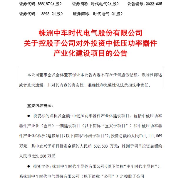 今日,我司發(fā)布了《株洲中車(chē)時(shí)代電氣股份有限公司關(guān)于控股子公司對(duì)外投資中低壓功率器件產(chǎn)業(yè)化建設(shè)項(xiàng)目的公告》。