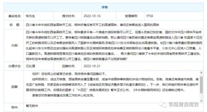 10月21日,四川省發(fā)改委鐵路和機場建設綜合處答復了網(wǎng)友關于四川省鐵路規(guī)劃建設的留言,詳情如下:
