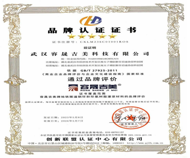 依據(jù)GB/T27925-2011《商業(yè)企業(yè)品牌評價(jià)與企業(yè)文化建設(shè)指南》國家標(biāo)準(zhǔn),武漢容晟吉美科技有限公司品牌覆蓋的“地鐵隧道鋼環(huán)和環(huán)氧樹脂灌漿材料”通過國家認(rèn)證認(rèn)可監(jiān)督管理委員會(huì)批準(zhǔn)的權(quán)威認(rèn)證構(gòu)頒發(fā)的品牌認(rèn)證證書。