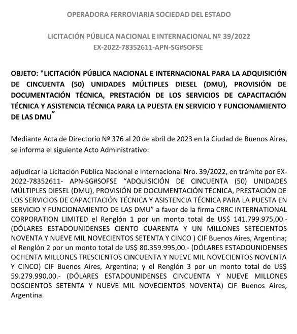 當?shù)貢r間5月16日,阿根廷鐵路公司宣布授予中國中車唐山公司供應 50 列3車編組全新列車的訂單,總價值1.8億美元。