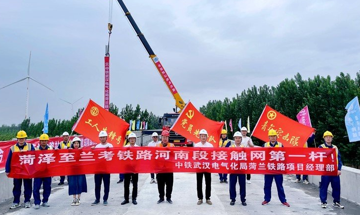 2023年5月21日上午,位于菏蘭鐵路蘭考特大橋施工現(xiàn)場,隨著吊車大臂緩緩起落,將一根長9米的接觸網(wǎng)支柱穩(wěn)穩(wěn)地固定在565#鋼柱基礎(chǔ)上。至此,菏蘭鐵路接觸網(wǎng)第一桿成功組裝,標志著由中鐵武漢電氣化局集團新建菏澤至蘭考鐵路河南段站后工程HLSD-I 標項目經(jīng)理部施工的菏蘭鐵路“四電”工程全面開工。