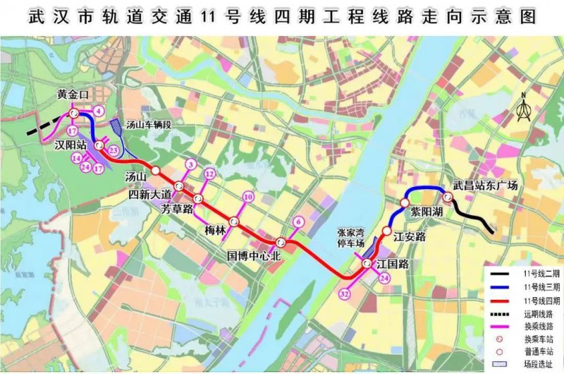 四期段起于漢陽站(不含),主要沿四新大道、規(guī)劃道路,新武金堤路敷設(shè),連接漢陽火車站、四新城市副中心及武昌白沙洲片區(qū),止于11號線三期工程起點江安路站(不含),是支撐城市東西向發(fā)展的重要軸線。