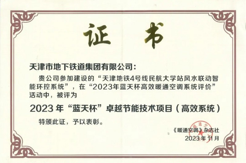 近期,2023年“藍(lán)天杯”高效暖通空調(diào)系統(tǒng)評價(jià)活動結(jié)果公布,天津地鐵4號線民航大學(xué)站“風(fēng)-水聯(lián)動”智能環(huán)控系統(tǒng)被評為2023年“藍(lán)天杯”卓越節(jié)能技術(shù)項(xiàng)目(高效系統(tǒng))。