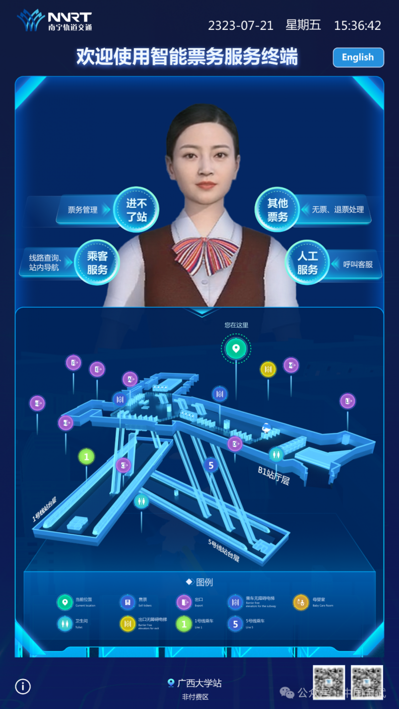 南寧地鐵5號線廣西大學(xué)站是南寧地鐵智慧車站首批試點之一。智慧車站系統(tǒng)仿若一個智能大腦,既能實時統(tǒng)計、分析車站的客流情況,實時監(jiān)控各項設(shè)備運行狀態(tài),又可根據(jù)人流密度等自動調(diào)節(jié)照明、空調(diào)等,讓車站管理更智能、更高效。進(jìn)站口票務(wù)自助處理終端里的“票務(wù)小姐姐”具備票務(wù)處理、票卡查詢、乘車查詢、出站口指引等多項功能;智能問詢機(jī)器人能“親自”送乘客到出口;出入口的智能顯示屏可查詢附近的景點、美食、實時公交信息和共享電單車信息;站臺屏蔽門上方的導(dǎo)乘屏實時顯示站名、運行方向、列車到站時間、車廂人流量等信息,讓人一目了然。