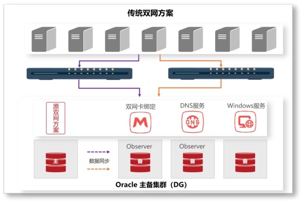 但是傳統(tǒng)雙網(wǎng)方案有諸多外部環(huán)境要求,比較典型的如:雙網(wǎng)卡綁定需要交換設(shè)備、域名到多個(gè)IP的映射需要DNS服務(wù)器、Windows服務(wù)要求數(shù)據(jù)庫(kù)集群必須部署在Windows端,傳統(tǒng)雙網(wǎng)方案與IT環(huán)境緊耦合,依賴操作系統(tǒng)協(xié)議轉(zhuǎn)換,在任意一個(gè)網(wǎng)絡(luò)異常的情況下,網(wǎng)卡切換都會(huì)存在性能損耗,導(dǎo)致業(yè)務(wù)切換體驗(yàn)差,后期通用性差、運(yùn)維困難。