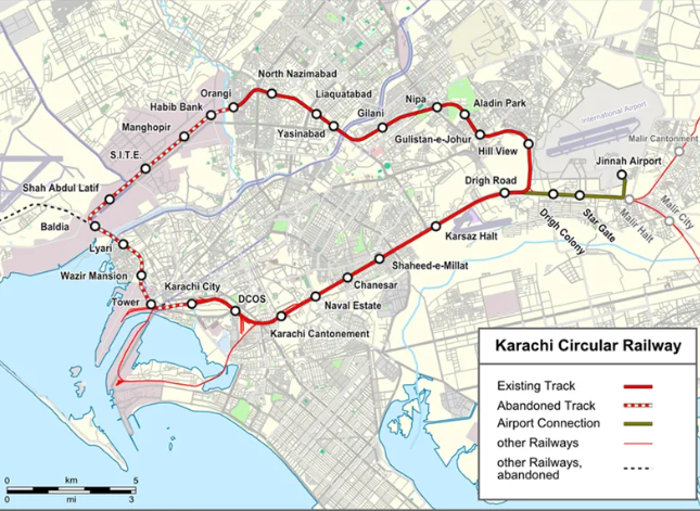卡拉奇環(huán)線鐵路KCR全長約43公里,軌距為1676mm,設有24個車站,位于巴基斯坦信德省卡拉奇市,在卡拉奇都市區(qū)提供通勤服務。