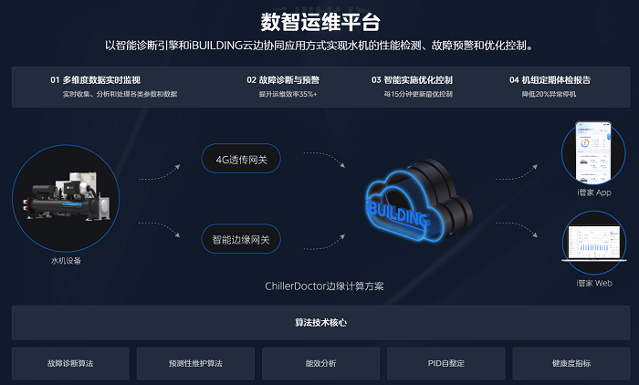 在運(yùn)維端,以iBUILDING云平臺(tái)加持,美的鯤禹磁懸浮提供數(shù)智運(yùn)維服務(wù)。通過將數(shù)字化技術(shù)運(yùn)用到離心機(jī)運(yùn)維當(dāng)中,實(shí)現(xiàn)了多維機(jī)組運(yùn)行監(jiān)控、全面體檢和評(píng)估、故障預(yù)警和定位以及智能實(shí)時(shí)優(yōu)化控制四大核心能力。運(yùn)維平臺(tái)搭載具有專家經(jīng)驗(yàn)的人工智能,可實(shí)時(shí)自動(dòng)優(yōu)化運(yùn)行,且能通過自修正數(shù)字孿生,實(shí)現(xiàn)對(duì)機(jī)組的精準(zhǔn)控制,達(dá)到每15分鐘更新最優(yōu)控制策略,降低40%系統(tǒng)運(yùn)行能耗。