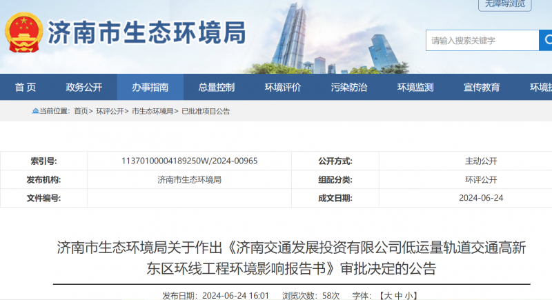 6月24日,濟南市生態(tài)環(huán)境局發(fā)布了關(guān)于作出《濟南交通發(fā)展投資有限公司低運量軌道交通高新東區(qū)環(huán)線工程環(huán)境影響報告書》審批決定的公告。批復(fù)表示原則同意環(huán)境影響報告書的總體評價結(jié)論和擬采取的環(huán)境保護措施。公告期為2024年6月24日-2024年7月2日(7個工作日)。
