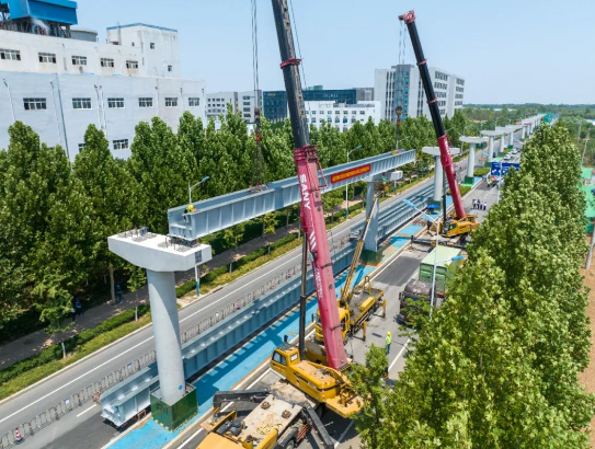 高新東區(qū)環(huán)線工程需架梁近2000榀,均為鋼結(jié)構(gòu)軌道梁,采用梁軌一體結(jié)構(gòu)設(shè)計(jì)。軌道梁全部采用汽車(chē)吊以雙機(jī)抬吊的方式架設(shè),目前已具備連續(xù)架梁條件。第一批軌道梁經(jīng)過(guò)原材檢驗(yàn)、過(guò)程質(zhì)量控制及出廠驗(yàn)收等,運(yùn)抵現(xiàn)場(chǎng)并預(yù)組裝完畢,架梁施工方案,人員安全教育培訓(xùn)等安全管控措施已落實(shí)到位,經(jīng)現(xiàn)場(chǎng)核查具備架梁條件。該項(xiàng)目車(chē)輛采用膠輪走行方式和主動(dòng)降噪措施,具有低噪音的特點(diǎn)。