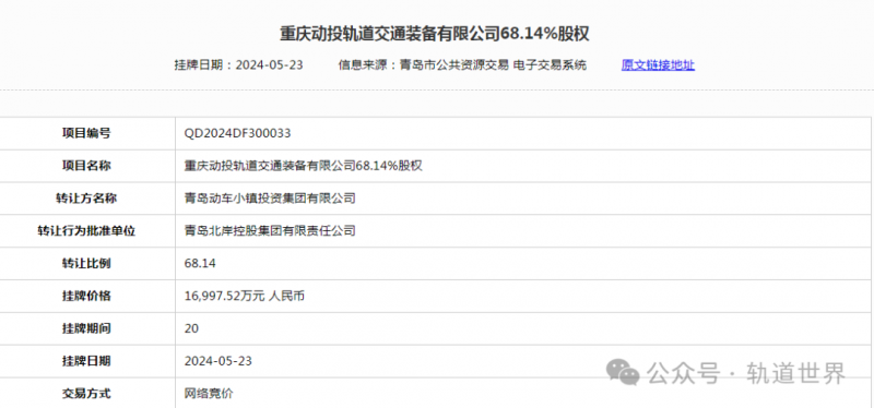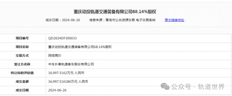 日前,重慶動(dòng)投軌道交通裝備有限公司68.14%股權(quán)交易結(jié)果披露,成交金額16997.51萬(wàn)元人民幣,轉(zhuǎn)讓方為青島動(dòng)車小鎮(zhèn)投資集團(tuán)有限公司,受讓方為長(zhǎng)客。