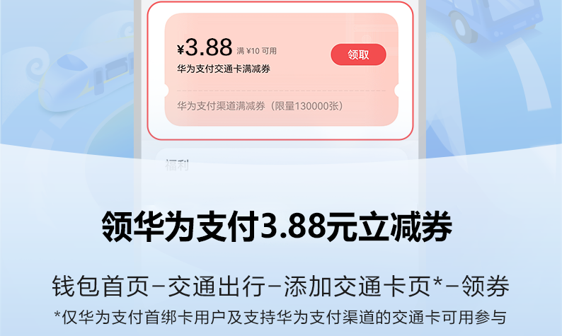 即日起至8月29日期間,暑期期間在華為錢(qián)包交通卡開(kāi)卡/充值界面華為支付新綁卡用戶可免費(fèi)領(lǐng)取3.88優(yōu)惠券一張,活動(dòng)參與方法特別簡(jiǎn)單,直接進(jìn)入華為錢(qián)包交通卡開(kāi)卡/充值頁(yè),即可看到優(yōu)惠券!領(lǐng)取后,一鍵開(kāi)通華為支付后即可使用!優(yōu)惠券數(shù)量有限,先到先得。大大的羊毛,快來(lái)參與吧!
