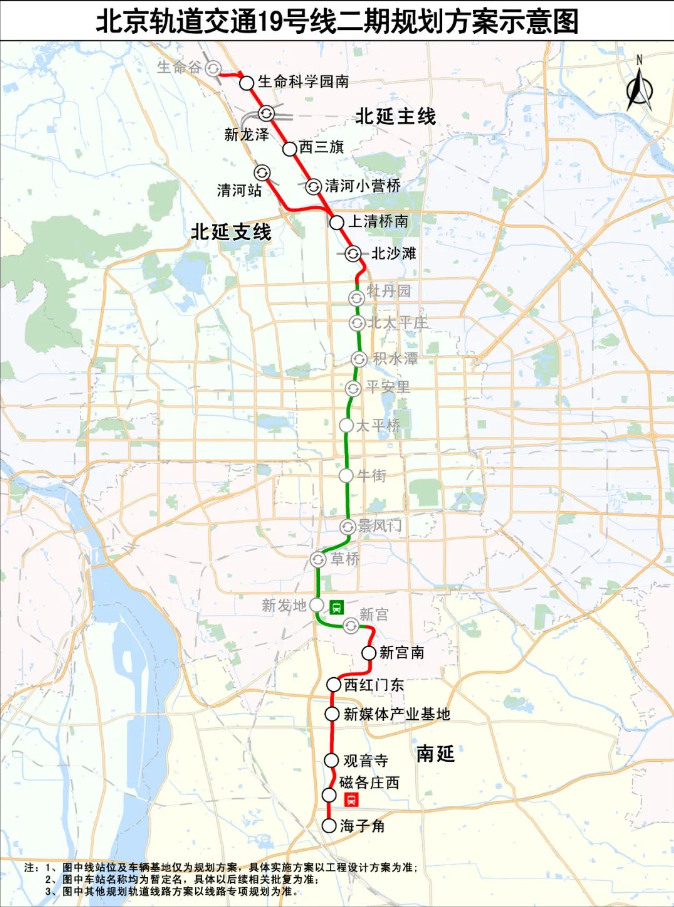 北京軌道交通19號(hào)線二期是既有19號(hào)線一期工程向南北方向的延伸線,全長約37.2公里、新設(shè)車站13座,包括北延、北延支線、南延三部分。其中,