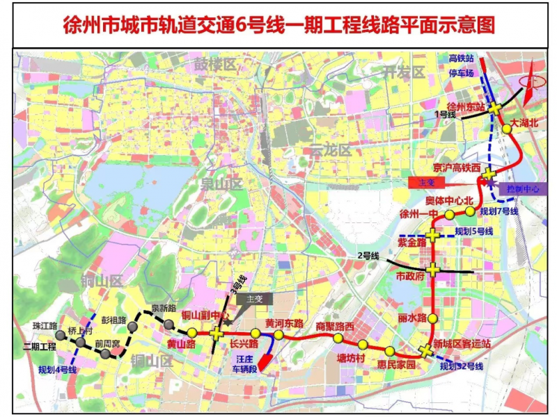 徐州地鐵6號(hào)線一期工程為一條反“L”形軌道交通線路,起點(diǎn)為黃山路與湘江路交叉口的黃山路站,途經(jīng)銅山區(qū)、云龍區(qū)與徐州經(jīng)開(kāi)區(qū),終止于徐州東站東廣場(chǎng),串聯(lián)銅山新區(qū)中心、新城行政商務(wù)中心、新城區(qū)客運(yùn)站、高鐵站等大型客流集散點(diǎn)。
