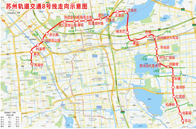 蘇州地鐵8號(hào)線全長(zhǎng)35.6公里,起于蘇州高新區(qū)西津橋站止于蘇州工業(yè)園區(qū)車坊站,全線設(shè)站28座,其中換乘站12座線路,連接了蘇州高新區(qū)、姑蘇區(qū)、相城區(qū)、工業(yè)園區(qū)等多個(gè)城市中心。