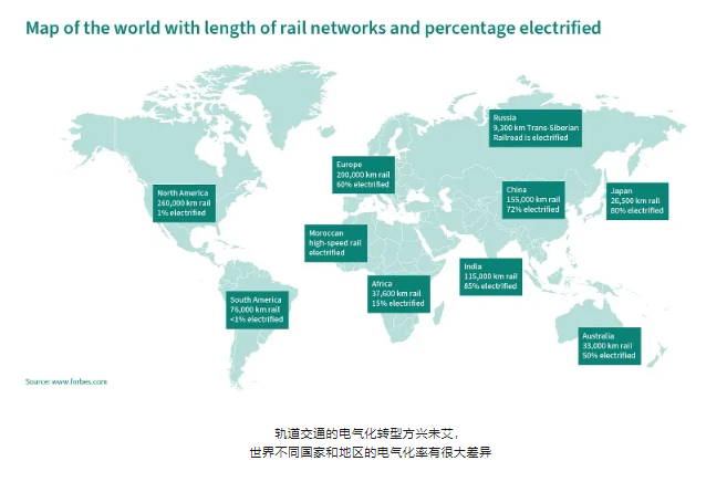 與電動汽車不同的是,電力機(jī)車已被廣泛使用了一百多年。然而,全球范圍內(nèi)的軌道交通電氣化轉(zhuǎn)型仍然方興未艾,不同國家和地區(qū)的軌道交通電氣化率存在著很大的差異。軌道交通的電氣化轉(zhuǎn)型方興未艾,世界不同國家和地區(qū)的電氣化率有很大差異。
