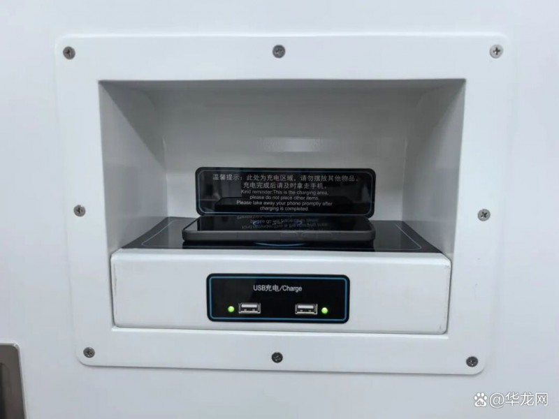 該輛列車車廂共設有三處無線充電設備,乘客只需將手機放在無線充電板上,即可實現(xiàn)充電??紤]到不同手機型號的適配問題,無線充電板下方還配備了USB充電口,每臺設備能同時滿足三部手機充電。