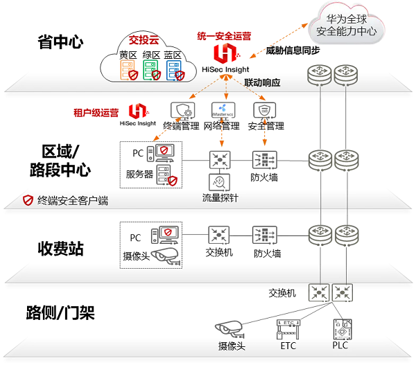 根據(jù)國家及交通行業(yè)標準規(guī)范要求,基于省級公路交通業(yè)務系統(tǒng)組成架構(gòu),華為提出星河AI公路云網(wǎng)端一體化安全防護架構(gòu),實現(xiàn)從終端、網(wǎng)絡、云平臺、業(yè)務應用到數(shù)據(jù)的安全防護,提供一體化、可視化、全局化的統(tǒng)一安全運營和全網(wǎng)協(xié)同防護。