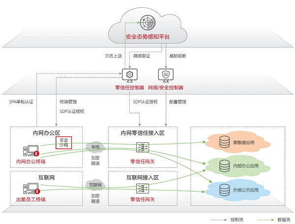 云南交投根據(jù)業(yè)務數(shù)據(jù)敏感度,劃分出黃、綠、藍不同安全等級區(qū)域。其中,財務及干部管理等應用屬于安全密級高的黃區(qū),普通辦公應用屬于安全密級中等的綠區(qū),門戶網(wǎng)站等對外公開應用屬于安全等級較低的藍區(qū)。云南交投通過零信任安全架構(gòu)建設,實現(xiàn)對用戶及終端持續(xù)威脅評估、動態(tài)授權(quán)及細粒度的訪問控制,有效縮減業(yè)務的“受攻擊面”,最大限度減小靜態(tài)授權(quán)、越權(quán)訪問等帶來的數(shù)據(jù)泄露風險。