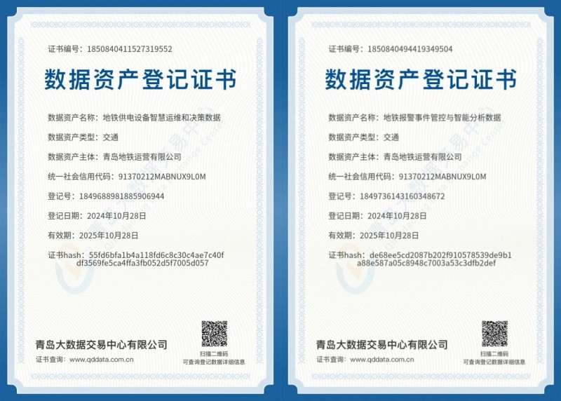 近日,《地鐵供電設(shè)備智慧運(yùn)維和決策數(shù)據(jù)》與《地鐵報(bào)警時(shí)間管控與智能分析數(shù)據(jù)》兩項(xiàng)數(shù)據(jù)資產(chǎn)成功獲得青島大數(shù)據(jù)交易中心頒發(fā)的數(shù)據(jù)資產(chǎn)登記證書(shū),并順利完成掛牌上架。這不僅是青島地鐵在數(shù)據(jù)資產(chǎn)領(lǐng)域取得的又一突破,同時(shí)也是青島地鐵在數(shù)字化轉(zhuǎn)型和人工智能應(yīng)用方面取得的又一成果。
