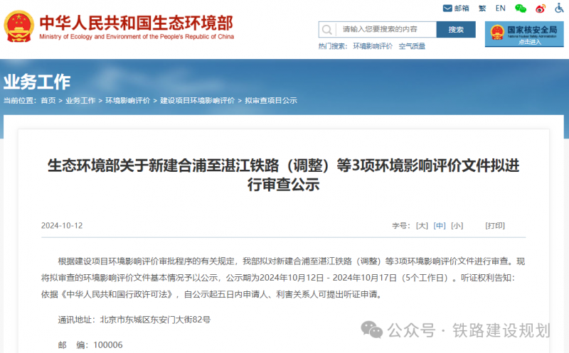 此前10月12日,生態(tài)環(huán)境部發(fā)布了《關(guān)于新建合浦至湛江鐵路(調(diào)整)等3項環(huán)境影響評價文件擬進行審查公示》,正式對合湛高鐵、長贛高鐵和銅吉鐵路環(huán)境影響評價文件進行審查。