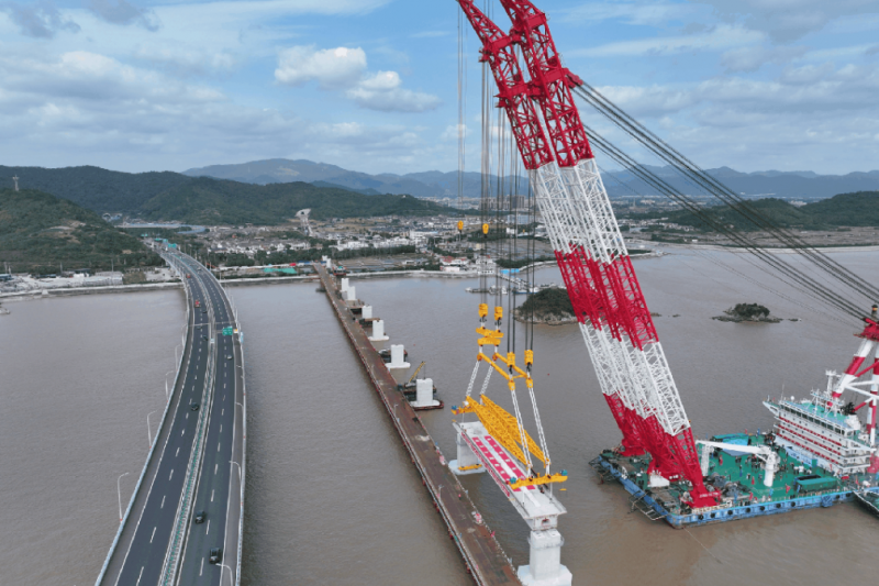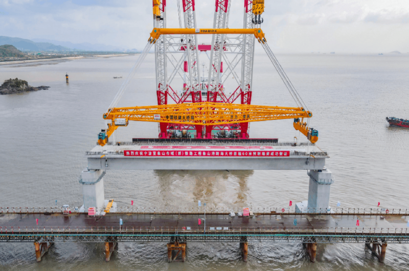 11月5日,隨著現(xiàn)場指揮一聲令下,重達(dá)1700噸的預(yù)制箱梁穩(wěn)穩(wěn)落至橋墩上,市域鐵路象山線跨海大橋首榀箱梁成功架設(shè),標(biāo)志著大橋全面進(jìn)入上部結(jié)構(gòu)施工階段。