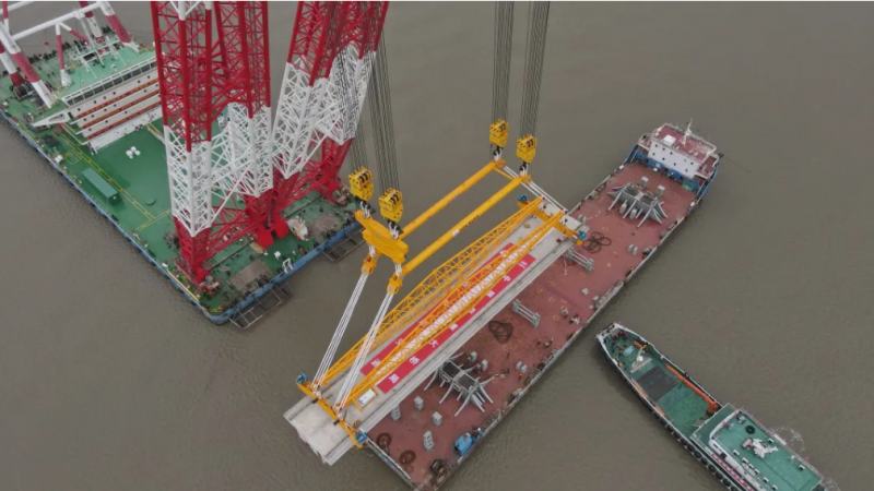 據(jù)悉,寧波軌道交通采用預(yù)制生產(chǎn)的方式,通過工廠“流水線”模式對箱梁進(jìn)行精密加工,有效提高了整體效率。箱梁在預(yù)制梁場完成驗(yàn)收后,經(jīng)專業(yè)船舶運(yùn)輸至海上,通過單片整體吊裝的方式,精準(zhǔn)定位吊裝至橋墩上。