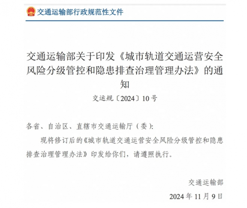 近期,交通部修訂發(fā)布了《城市軌道交通運(yùn)營安全風(fēng)險(xiǎn)分級管控和隱患排查治理管理辦法》。