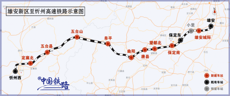 新建雄安新區(qū)至忻州高速鐵路起自京雄鐵路雄安站,經(jīng)河北省雄安新區(qū)、保定清苑區(qū)及望都、曲陽(yáng)、阜平等縣,山西省五臺(tái)山風(fēng)景區(qū),忻州市五臺(tái)縣、定襄縣,接入忻州西站,正線全長(zhǎng)342公里,全線設(shè)12個(gè)車站(含一個(gè)預(yù)留車站),雄安新區(qū)地下利用擬建的東西軸線隧道工程進(jìn)行布設(shè),同步建設(shè)相關(guān)存車場(chǎng)、存車線。