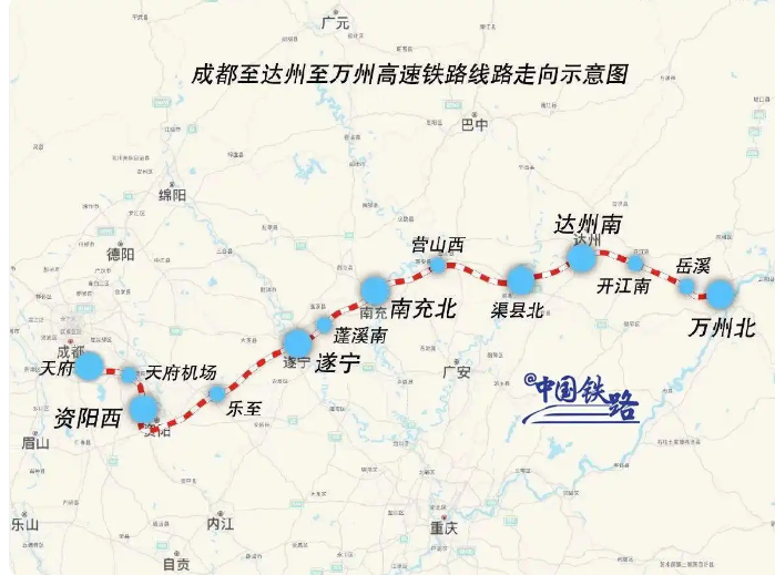 成達萬高鐵全線設(shè)車站13個,其中新建樂至、蓬溪南、營山西、渠縣北、達州南、開江南、岳溪7座車站,利用成自宜高鐵天府、天府機場、資陽西3座車站,引入既有遂寧、南充北、萬州北3座車站。