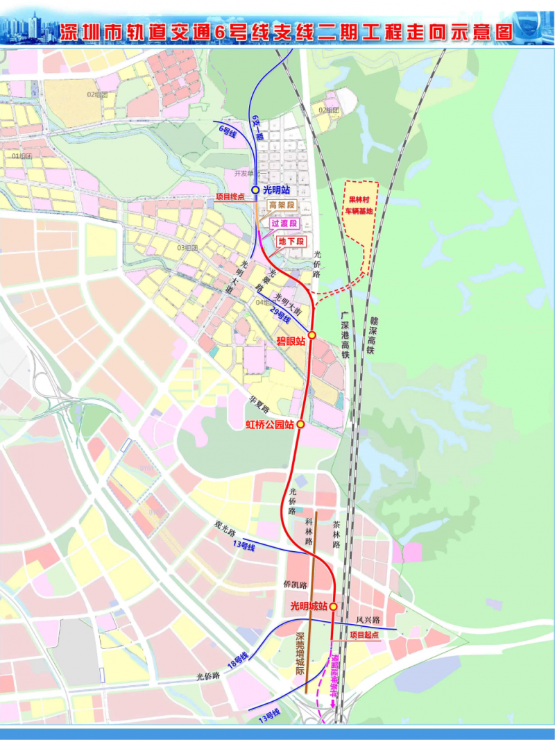 6號線支線二期工程敷設(shè)在光明區(qū)內(nèi),起自6號線支線一期工程光明站(原翠湖站),終至光明城站 ,線路全長約4.944km,共設(shè)3站。站點為:碧眼站、虹橋公園站、光明城站。線路共配屬車輛4列(24輛),采用4動2拖6輛編組B型車,DC1500V架空接觸網(wǎng)/接觸軌供電方式,最高運行時速120公里。