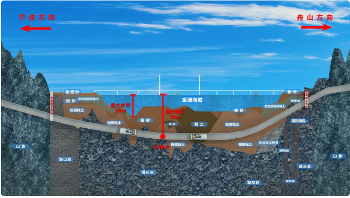 金塘海底隧道是甬舟鐵路全線控制性工程,位于寧波與舟山之間金塘水道下方,西起寧波市北侖區(qū),東至舟山市金塘鎮(zhèn),全長16.18公里,其中盾構(gòu)段長11.21公里,是世界最長海底高鐵隧道。隧道采用“定海號”“甬舟號”兩臺盾構(gòu)機分別從舟山側(cè)、寧波側(cè)同時始發(fā),相向掘進,穿越高水壓及多種復雜地層后在海底實現(xiàn)精準對接。