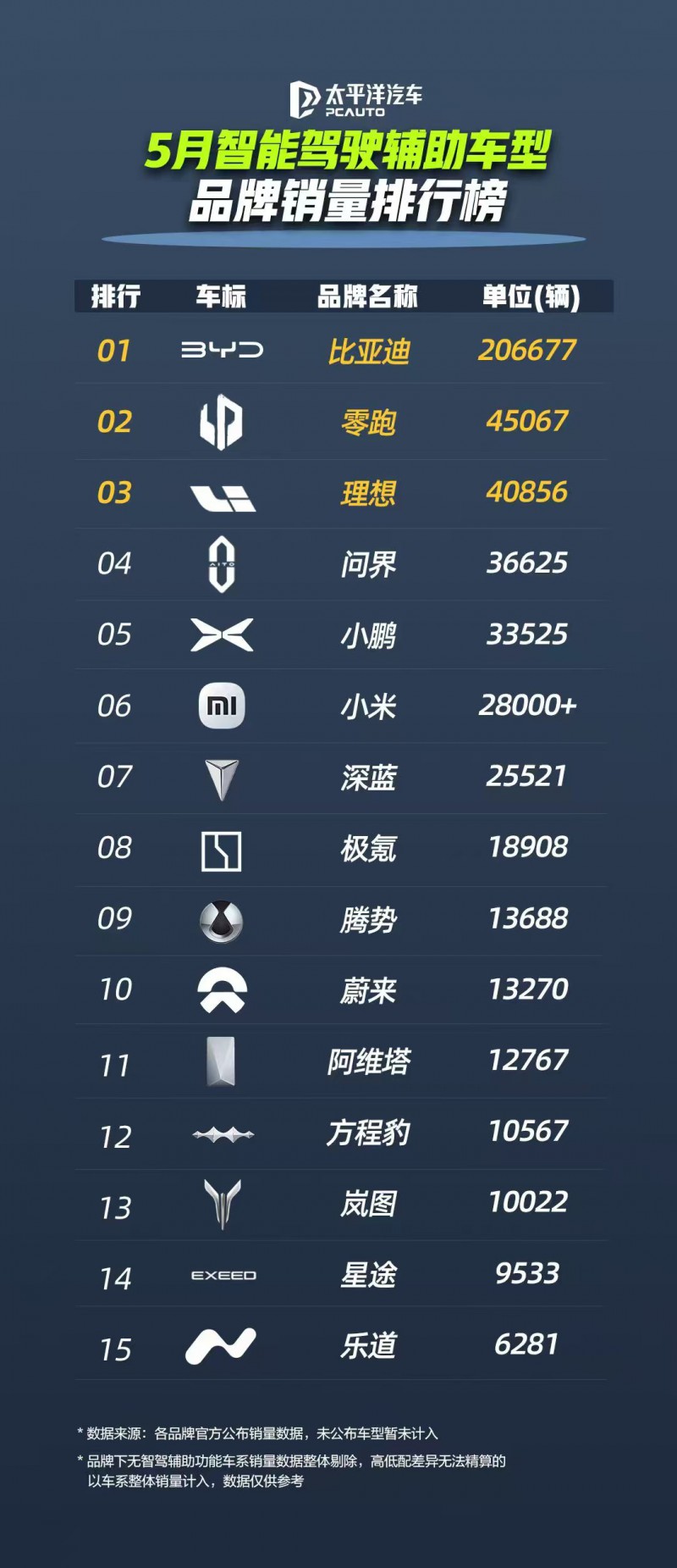 從車型品牌維度深入剖析,王朝系列和海洋網(wǎng)系列作為比亞迪的銷售主力軍,在 5 月表現(xiàn)依舊亮眼,智駕車型銷量達(dá) 206,677 輛,展現(xiàn)出強(qiáng)大的市場號(hào)召力。方程豹品牌盡管定位獨(dú)特,但其 5 月 10,567 輛的銷量成績,顯示出硬派越野與智能駕駛?cè)诤虾螽a(chǎn)生的獨(dú)特魅力,市場潛力不容小覷。騰勢品牌憑借其高端家用定位,售出 13,688 輛智駕車,彰顯了其在中高端市場的穩(wěn)固地位。仰望品牌雖銷量相對較少,僅為 127 輛,但其作為比亞迪沖擊高端智能駕駛市場的先鋒,以頂尖技術(shù)樹立了品牌高度,為后續(xù)發(fā)展奠定了良好基礎(chǔ)。
