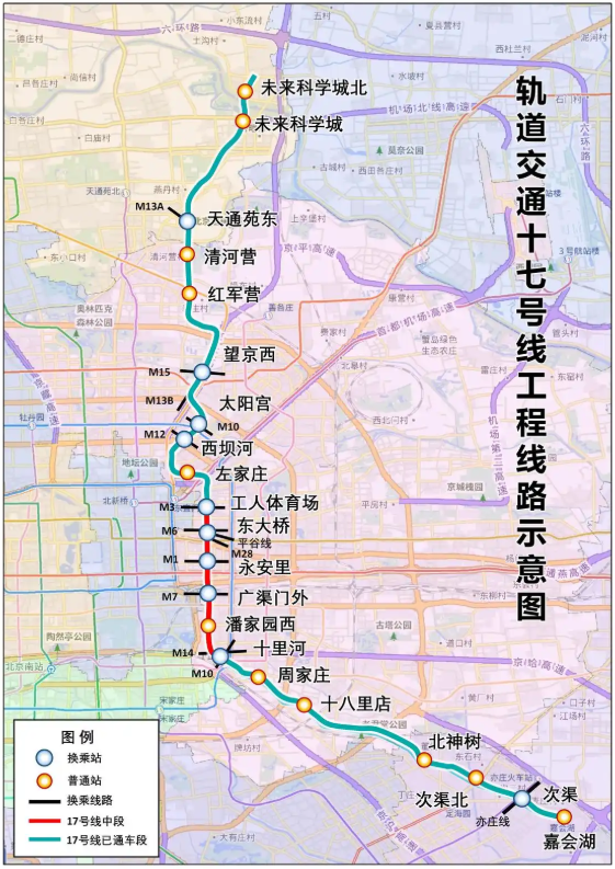 北京地鐵17號(hào)線是一條貫穿東部城區(qū)南北方向的大運(yùn)量等級(jí)軌道交通干線,線路南起嘉會(huì)湖站,北至未來(lái)科學(xué)城北站,全長(zhǎng)49.97公里,共設(shè)車站21座,途徑通州、朝陽(yáng)、東城、昌平四個(gè)行政區(qū)。全線分三段開通,其中南段(嘉會(huì)湖—十里河)已于2021年底通車運(yùn)營(yíng),北段(工人體育場(chǎng)—未來(lái)科學(xué)城北)已于2023年底通車運(yùn)營(yíng)。