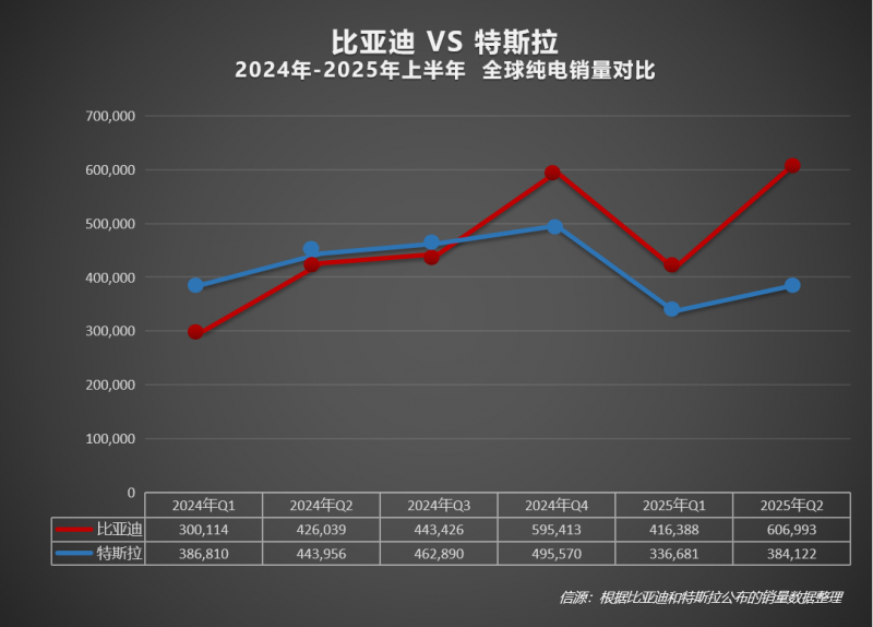 比亞迪上半年累計(jì)銷量近214.6萬輛,繼續(xù)領(lǐng)跑全球汽車市場,也是全球唯一一家上半年銷量超200萬的中國車企。其中,比亞迪純電車型銷量約占上半年總銷量的一半,超102萬臺(tái)。2025年上半年,特斯拉累計(jì)銷量超72萬臺(tái)。