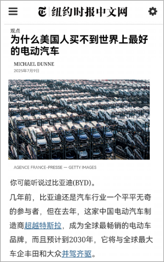 最近,美國《紐約時(shí)報(bào)》評論稱,比亞迪已成為全球最暢銷的電動(dòng)車品牌。預(yù)計(jì)在2030年,比亞迪將與全球最大車企豐田和大眾并駕齊驅(qū)。在比亞迪這樣的民族企業(yè)帶領(lǐng)下,中國已經(jīng)取代了底特律,成為全球汽車工業(yè)的中心。